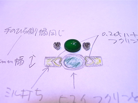 大阪にお住まいのK様からの御依頼です。 とてもきれいなろうかん翡翠とハートシェイプの ダイヤを材料に指輪を作っていきます。 デザインはK様が書かれたデザイン画をもとに お作りしていきます。 私も翡翠が大好きなので完成させるのが楽しみです!