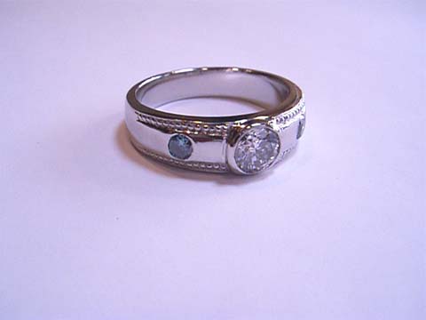 ホームページを見られたお客様のリフォームが完成しました。お送り頂いた指輪に大きめのダイヤとブルーダイヤが 2個付いていたのでアンティーク調の雰囲気ある指輪にデザインしました。いい出来映えになっています。