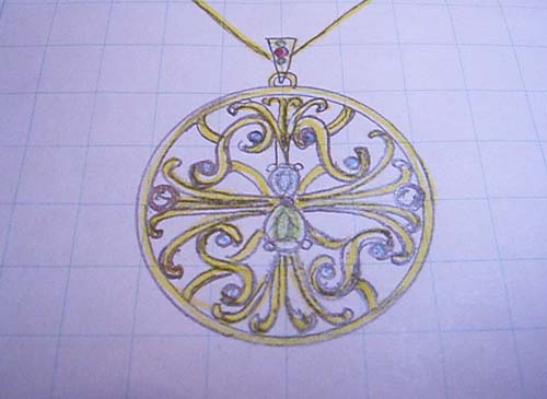 ホームページをご覧頂いたお客様より若い頃に楽しんでいたジュエリーを使ってアンティークなデザインでペンダントを作って欲しいとご相談を受けました。デザイン画を考えるのに苦労しましたが、ペンダントとして仕上がるのがとても楽しみです。