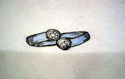 Y様のデザイン画を紹介します。私がデザインを書く時はまず、ラフデザインをお客さまとお話しながら書き上げていきます。お話の中で新し考えがうかんできたり、お客さまの提案が出てきたりしてデザインが決まります。この時間がとても楽しい時なのですが集中力もいります。そして清書をして色付けしてできあがりです。あとは細かな仕用を決めて加工に入っていきます。